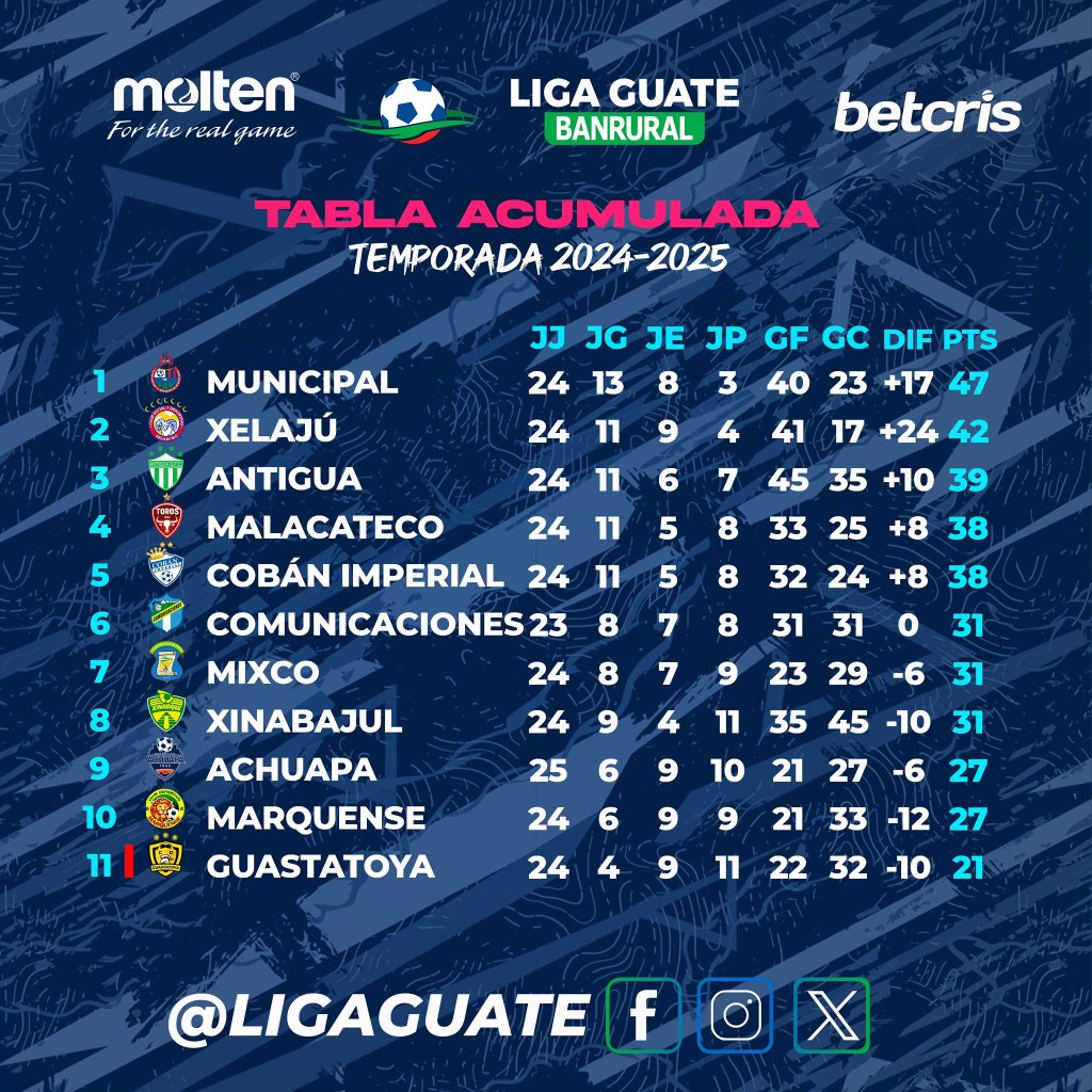 Con el inicio del torneo Clausura 2025, los 11 equipos participantes lucharán hasta el final para mantener la categoría en la tabla acumulada. Luego del descenso en automático de Zacapa, únicamente un equipo será el descendido durante el Clausura 2025. Todo parece apuntar a que la lucha será entre Marquense y Guastatoya, que se distancian de la zona segura; únicamente el tiempo dirá quién sea el que acompañe a los gallos.