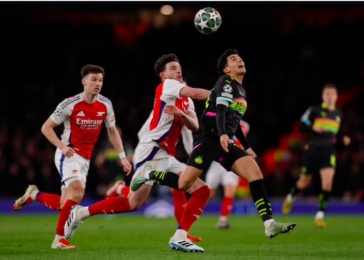 Pero Ivan Perisic respondió para los visitantes con una definición sublime en el minuto 18 que dio a los miles de entusiastas hinchas del PSV un motivo para vitorear.Declan Rice puso al Arsenal nuevamente en ventaja con un cabezazo tras un centro preciso de Raheem Sterling antes del medio tiempo, pero el PSV obtuvo una merecida recompensa por una exhibición enormemente mejorada cuando Couhaib Driouech anotó con calma el gol del empate en el minuto 70.