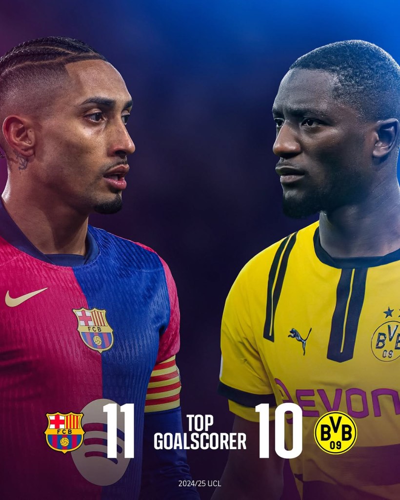 Raphinha, teniendo una temporada destacada con 11 goles en la Liga de Campeones para el Barcelona, se enfrentará al delantero del Dortmund, Serhou Guirassy, que tiene 10 junto con Harry Kane del Bayern de Múnich.