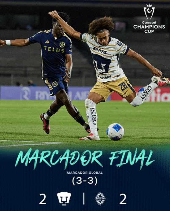 Pumas quedó eliminado de la Concacaf Champions Cup, luego de empatar 2-2 esta noche en el Olímpico Universitario ante Vancouver Whitecaps (3-3 global) en el duelo de Vuelta de Cuartos de Final. De paso, los felinos se perdieron la posibilidad de enfrentar en Semifinales al Inter de Miami, liderado por Lionel Messi.