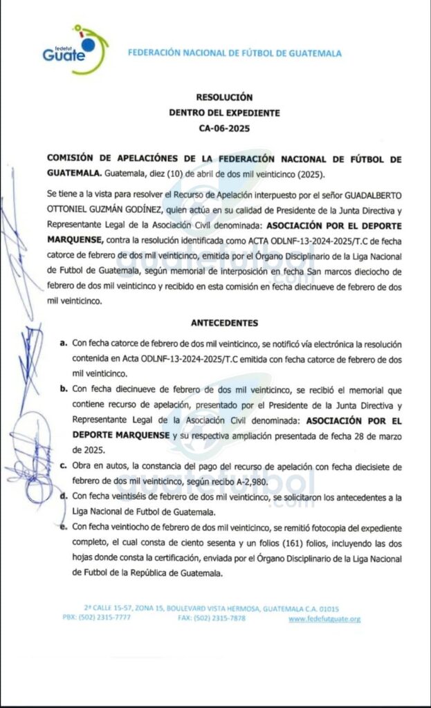 Después de tantos idas y vueltas, la Comisión de Apelaciones de la Federación Nacional de Fútbol de Guatemala (Fedefut) confirmó la resolución del caso Ramiro Rocca y la alineación indebida en el juego entre Deportivo Marquense y Xinabajul Huehue en la primera fecha del Torneo Clausura 2025.