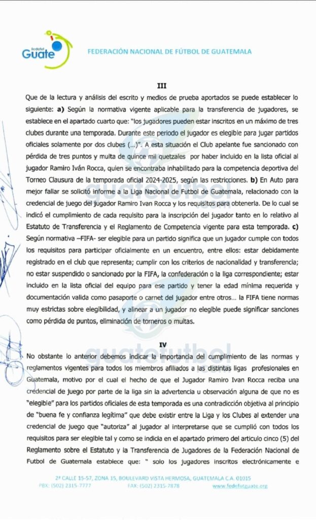 Por otro lado, en el mismo documento, la Comisión de Apelación señala que a Ramiro Rocca se le otorgó la credencial de juego por parte de la Liga Nacional “sin la advertencia u observación alguna de que no es elegible para los partidos oficiales de esta temporada”.