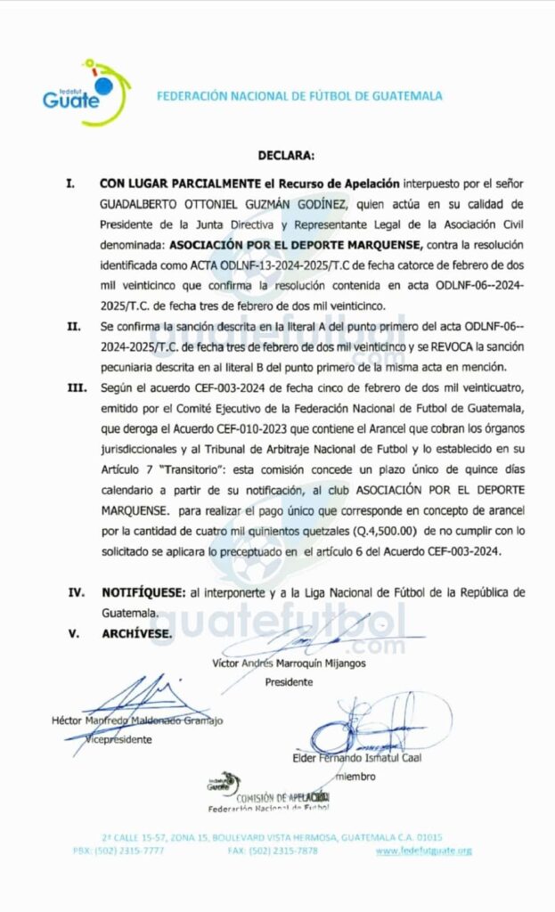 La resolución establece además que Marquense dispone de un plazo de 15 días para efectuar un “Pago único que corresponde al concepto de arancel por la cantidad de 4 mil 500 quetzales”.