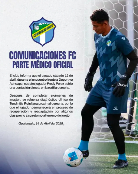 A través de un comunicado oficial, Comunicaciones confirmó con certeza qué le ocurrió al portero chapín. Según el parte médico, “Fredy Pérezsufrió una contusión directa en la rodilla derecha” en el partido del sábado. Luego de realizarse una serie de estudios, se determinó que tiene una tendinitis rotuliana en dicha zona.