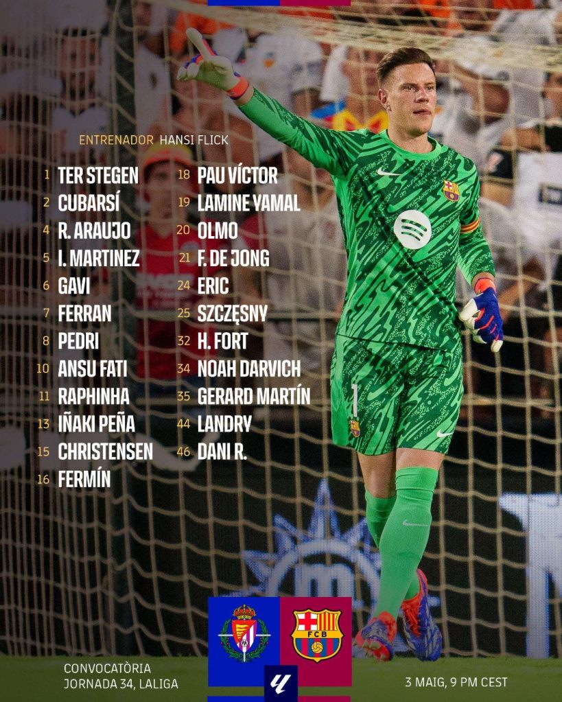 El FC Barcelona se enfrenta al Real Valladolid en el Estadio José Zorrilla, en un partido correspondiente a la jornada 34 de LaLiga EA Sports. Los azulgranas, líderes del campeonato con 76 puntos, buscan ampliar su ventaja de cuatro unidades sobre el Real Madrid, que juega el domingo, y mantener el impulso de cara a la semifinal de la Champions League contra el Inter de Milán.