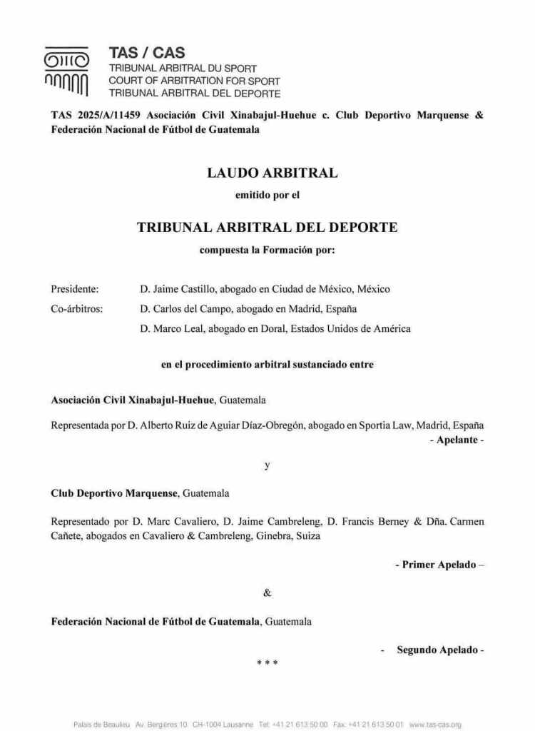 El TAS fue tajante: anuló la decisión del Tribunal de Arbitraje Nacional (TAN), que en su momento benefició a Marquense, dejando a Xinabajul fuera de la Liga Nacional. Ahora, el fallo internacional restablece a la X como equipo de primera… al menos sobre el papel.