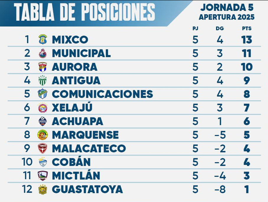 Apenas cinco jornadas disputadas y el Apertura 2025 ya arde: Mixco se aferra al primer puesto, pero Municipal acecha con hambre de gloria, mientras los tradicionales Comunicaciones y Xelajú levantan la mano para una lucha que promete emociones hasta el final.
