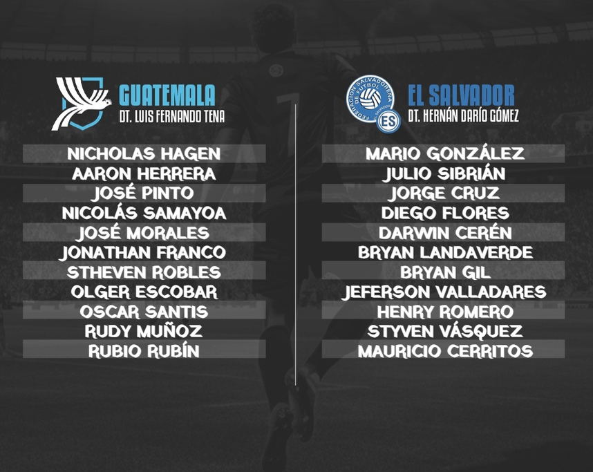 Once inicial de Guatemala: Nicholas Hagen; Aaron Herrera, José Carlos Pinto, Nicolás Samayoa, José Morales; Jonathan Franco, Stheven Robles, Olger Escobar, Óscar Santis; Rudy Muñoz y Rubio Rubín.