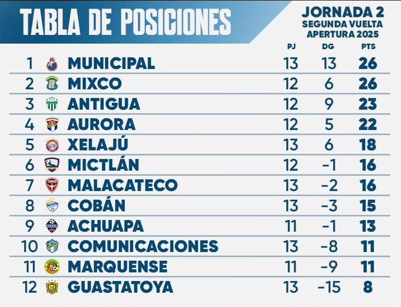 Los “Rojos” de Municipal se mantienen en la punta por diferencia de goles, mostrando solidez con 23 tantos a favor y apenas 10 en contra. Pero Mixco, con un rendimiento notable (8 triunfos en 12 partidos), no baja la guardia y se confirma como la gran revelación del campeonato.