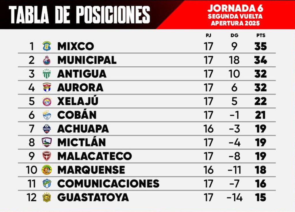 Comunicaciones también respiró. Tras seis jornadas sin triunfo, los albos vencieron 2-0 a Achuapa y mantienen vivas sus aspiraciones de clasificar. En tanto, Malacateco ganó el Derbi de San Marcos al imponerse 2-1 a Marquense, un resultado que lo mantiene con vida en la pelea por los ocho mejores.