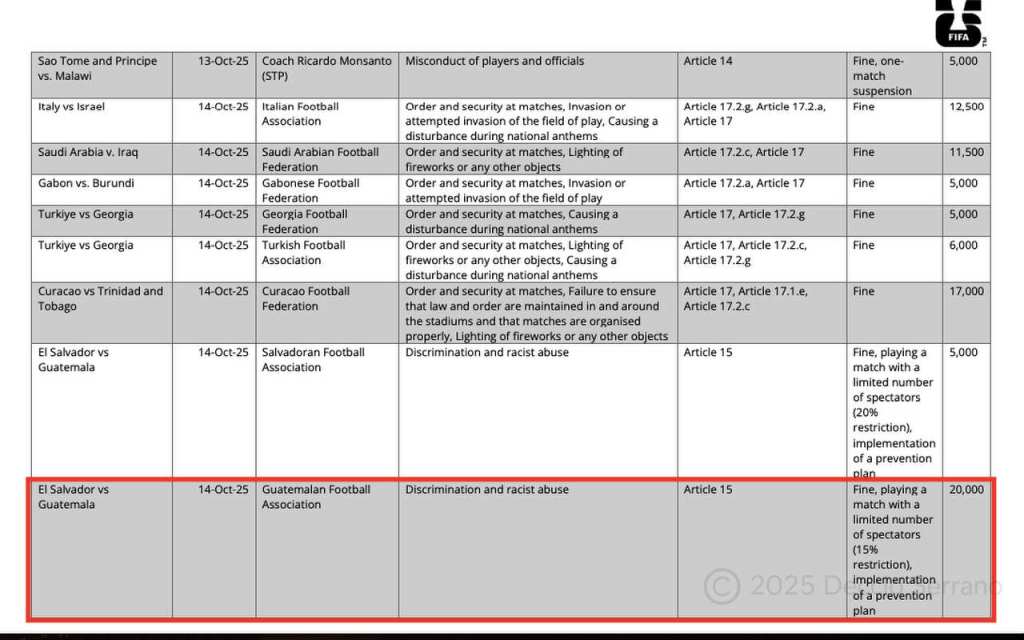 La Federación Nacional de Fútbol de Guatemala (FEDEFUT) deberá pagar una multa de 20 mil francos suizos (unos 190 mil quetzales) y, lo más preocupante, enfrentar una reducción del 15% del público en su próximo partido como local el 14 de noviembre ante Panamá en el estadio El Trébol.